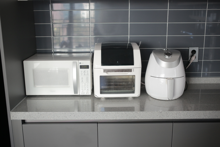 냉장고 옆에서부터 바로 ㄷ자 싱크대가 이어지는데요, 가전제품은 모두 여기에다 놨어요. 왜냐면 이곳이 가장 잘 안 보이는 곳이라서^^; 전자레인지와 에어프라이어 2개가 있어요. 에어프라이어는 하나는 3.6리터 짜리고 또 하나는 12리터짜리.... 하나론 턱없이 부족할 때가 종종 있어서 하나 더 놓게 되었네요.
