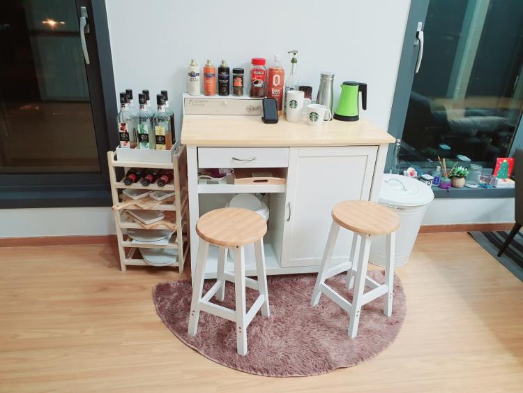 카페 시럽, 소스를 보관하고 있고 전기 주전자를 놨어요. 원래 예전 살 때엔 이걸 식탁으로 썼어요. 아일랜드 식탁인데 뒷부분에 테이블이 더 있어요. 접을 수 있고 올려서 확장해서 식탁으로도 사용 가능하답니다. 지금은 그냥 구석에 요렇게 홈바처럼 쓰고 있어요. 이렇게도 해보고 저렇게도 해봤지만 딱 지금처럼 놓는 게 잘 어울리더라고요.