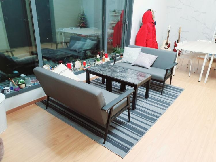 여기 그레이 스트라이프 러그는 원래 중앙에 하나만 깔아놨었는데요, 너무 답답해 보여서 같은 걸로 하나 더 구매해서 두 개 깔았어요.멀리서 보면 그냥 큰 러그 하나처럼 보여요 ㅎㅎ 커피나 차 마실 때 여기서 마시면 커피숍 온 것 같은 느낌이라 좋아요.