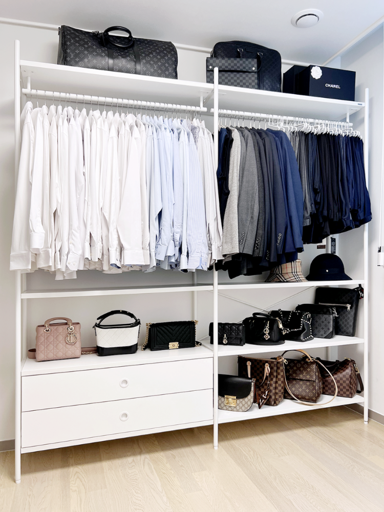 그리고 오픈형 시스템 행거에는 비교적 깔끔한 남편 정장들을 걸어두었어요. 와이셔츠와 정장들은 이렇게 보이게 있어도 덜 지저분해보이거든요. 아래쪽은 제 가방 수납장으로 사용 중이에요.