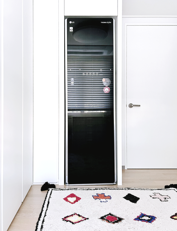 남편이랑 연애때 제가 선물해줬던 스타일러는 사이즈도 크고 디자인도 투박하지만 잘 사용하고 있어요. 성능은 정말 좋거든요. 그냥 보이게 놓는 것보다 ㄱ자 붙박이장 안쪽에 놓아두는 것이 깔끔해보일 것 같아 이렇게 사이즈를 맞춰 붙박이장으로 넣어두었답니다.