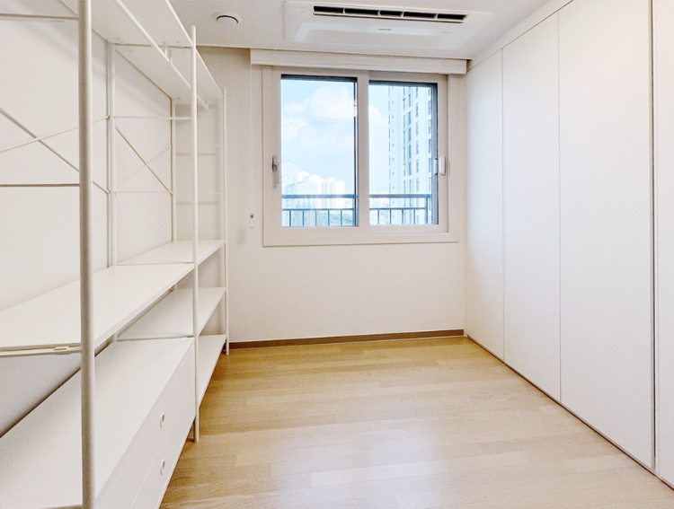 다음은 드레스룸이에요. 가장 작은방 하나를 드레스룸으로 사용하고 있는데요. ㄱ자로 붙박이장을 시공하고 한쪽 벽에는 시스템행거를 설치했어요. 에어컨은 시스템에어컨으로 시공해 공간을 차지 하지 않도록 하였고