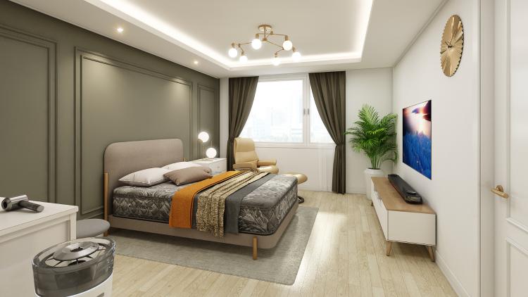 침실은 카키 톤에 골드 컬러 포인트를 조합해 공간을 고급스럽게 꾸몄어요. 재충전하며 쉬는 공간이 중점인 만큼 톤 다운된 컬러를 베이스로 사용해 차분하면서 편안한 느낌을 가득 담았어요. 거기에 더해지는 골드 아이템은 과하지 않게 럭셔리한 포인트가 돼주는 것 같아요. 특히 골드 프레임의 거울은 실용성과 인테리어 면에서 만족스러워요.