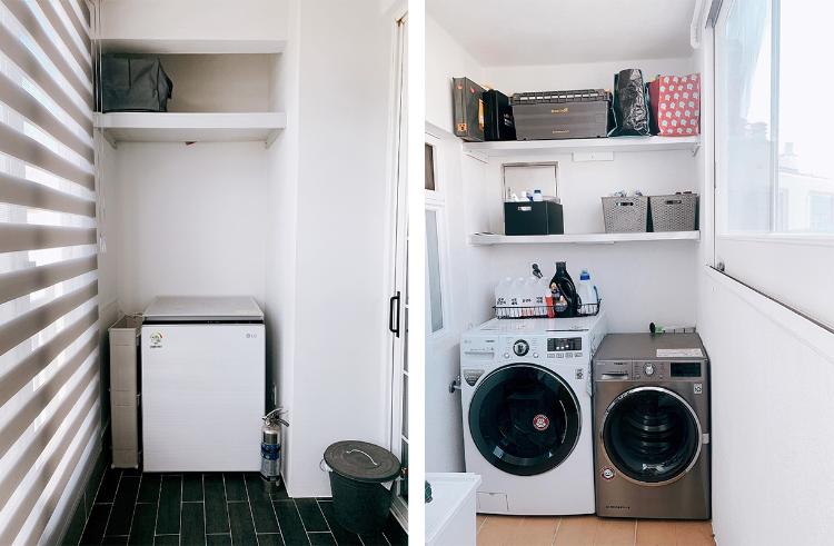 맞은편으로 문이 또 있어서 열고 들어가면 세탁실입니다. 세탁기 옆에 건조기를 나란히 놓고 그 위로 선반을 짰더니 유용하더라고요.
