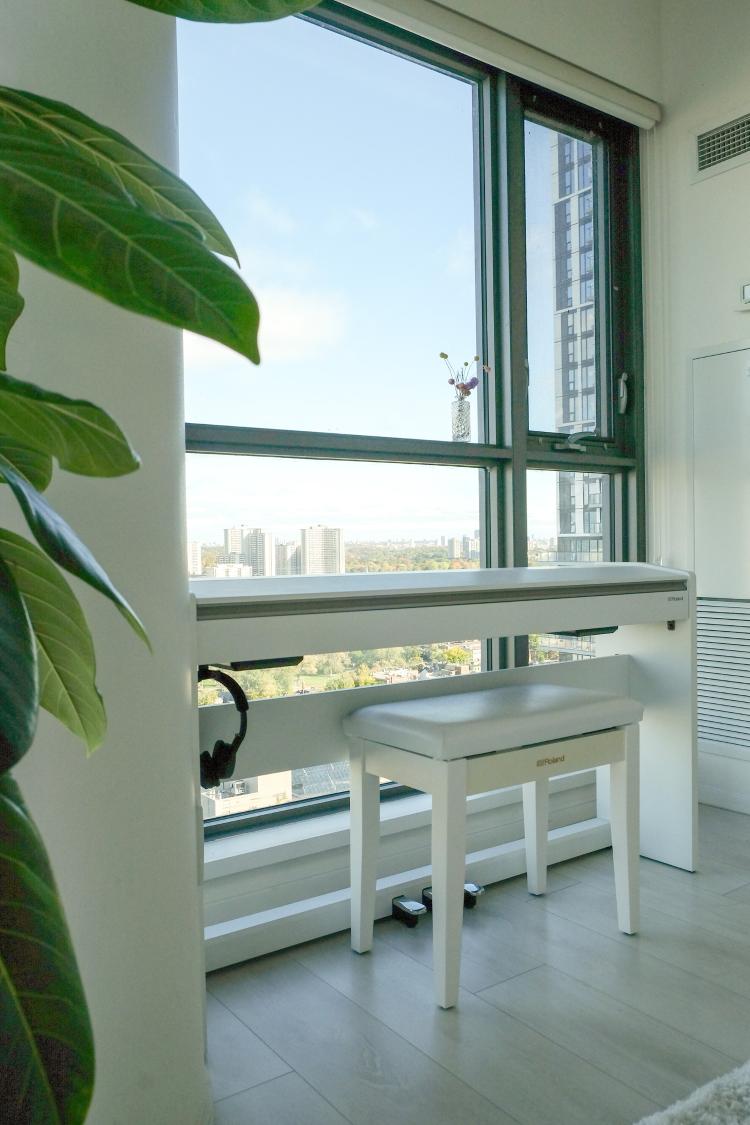 소파 오른 편에는 이렇게 하얀색 전자피아노가 위치해 있어요. 각자 다른 나라에서 자란 저희 둘이지만 공통점이 있는데 여행을 좋아한다는 것과 취미로 사진 찍기 그리고 피아노 치는 것이에요.