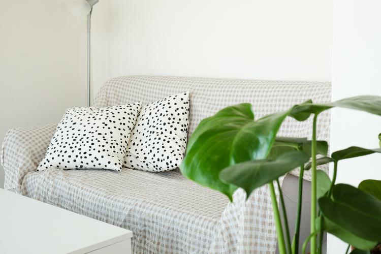 벤치 사이로 보이는 저희 집 소파에요. 원래는 연한 회색 패브릭 소파로 구매했는데요.