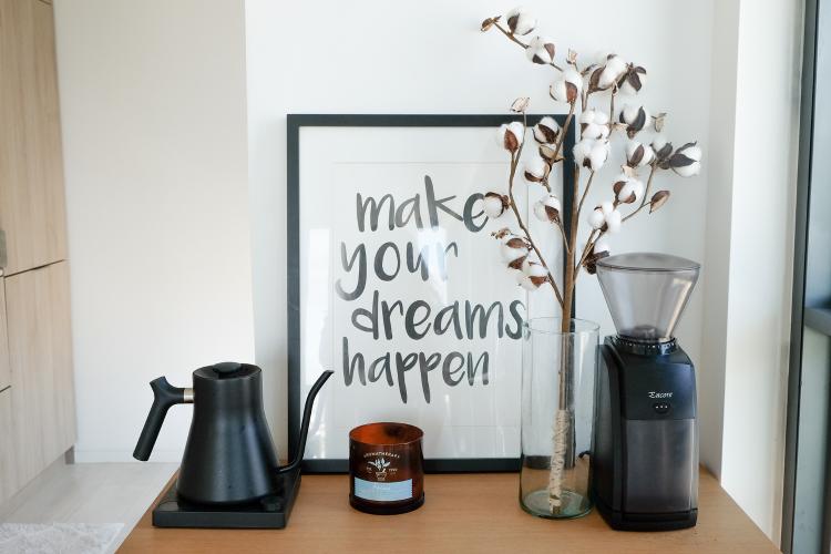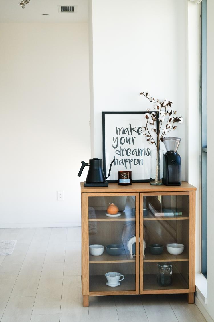 신혼사진을 인화해서 걸어 놓으려다 글귀가 마음에 들어서 그냥 둔 액자, 제가 매일 마시는 커피, 한국에서 사온 도자기 세트와 향초, 그리고 가을/겨울 느낌 물씬 나는 목화를 놓아두었어요.
