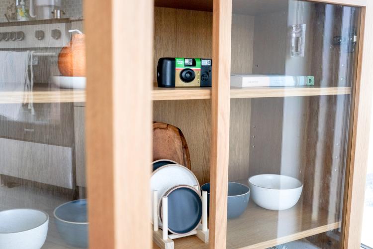 그래서 벤치로 공간 분리를 해주고 좁은 주방 공간에 놓기 힘든 작은 가전들은 저렇게 수납장을 사서 그 위에 셀프 바처럼 꾸며 두었어요.