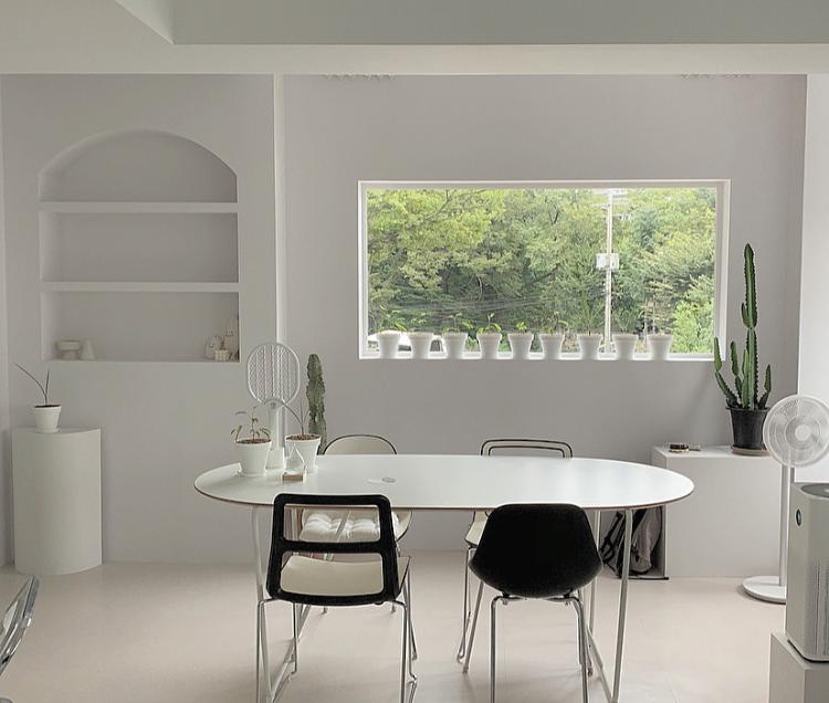 Pc테이블과 회의테이블은 모두 모서리가 없는 원의 형태로 구입하였어요. 내부가 넓은 편이 아니라 모서리가 없는 반원 혹은 원형 테이블로 배치하여 동선을 확보하고 공간과 어울리는 예쁜 곡선들로 올 화이트 공간에 디자인 포인트를 줄 수 있었어요.