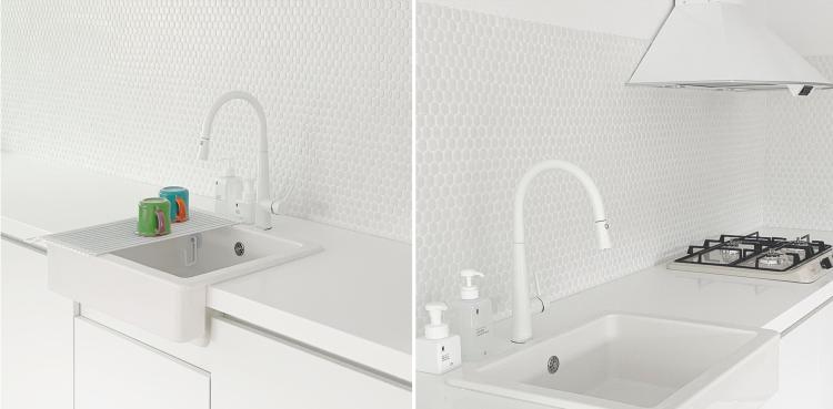노출형 도기싱크와 슈티에 수전, 하츠 몽블랑 후드 등 곡선이 예쁜 화이트 주방 설비들을 설치하여 통일된 화이트 컬러 안에서 아름다운 선으로 디자인 포인트를 주었어요.