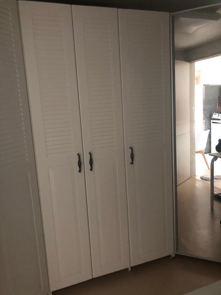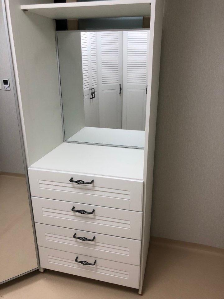 저희 집은 방이 하나인데 이 방을 어떻게 하면 수납을 잘할 수 있을까 고민하다가 코너장까지 만들 수 있는 업체에서 가구를 제작했어요. 모든 공간을 활용할 수 있는 최선이었어요. 코너장은 수납도 넓고 한쪽에 거울이 달린 장이라서 방도 넓어 보여요. 화장대로 활용할 수 있는 장도 만들었고요.