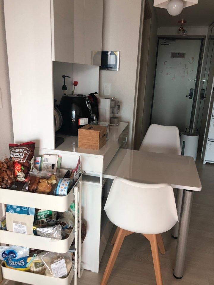 이 식탁은 쭉 꺼내면 1미터 정도까지 길어져서 4명이 충분히 식사할 수 있는 공간이 돼요. 평소에는 주방이 좁아 보이지 않게 식탁을 안쪽까지 넣어놓고 있어요. 밑에 선반에는 오븐과 밥솥. 그리고 아래쪽에 서랍장까지 있어서 수납이 너무 맘에 드는 식탁 조장이에요.
