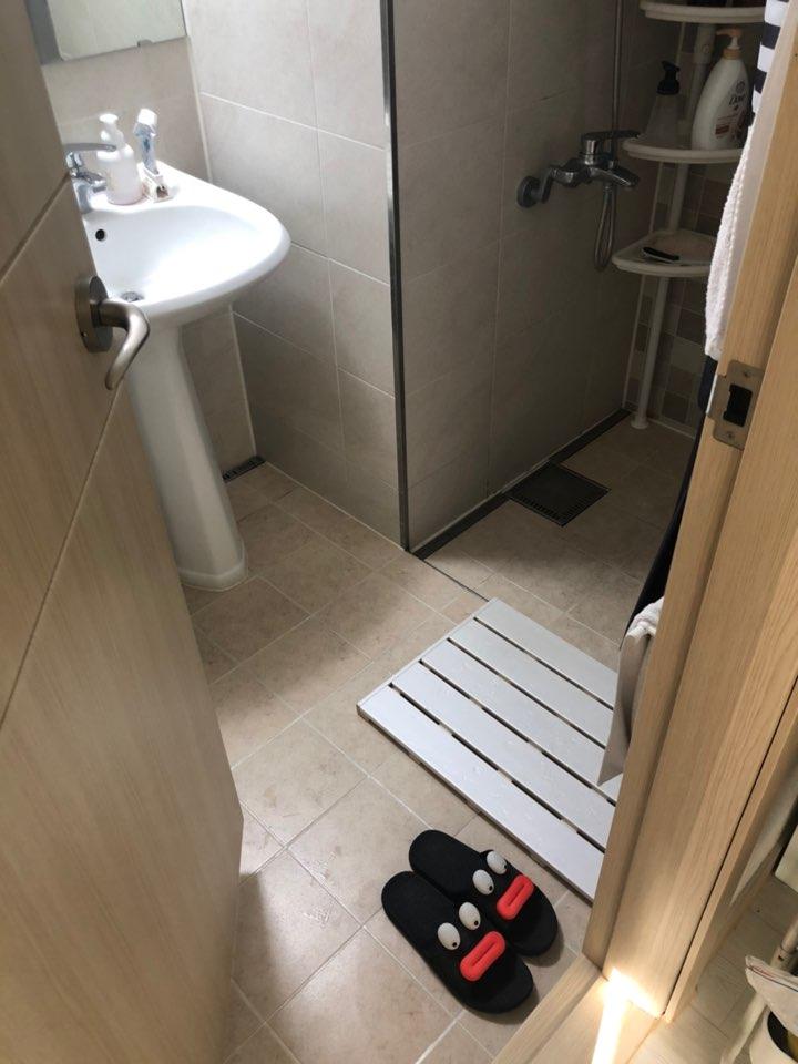 샤워하고 바로 물기를 닦기 위해 바로 앞에 발판을 두었는데 나무는 금방 곰팡이가 생기더라고요. 그래서 나무가 아닌 플라스틱 재질의 발판을 두었어요.