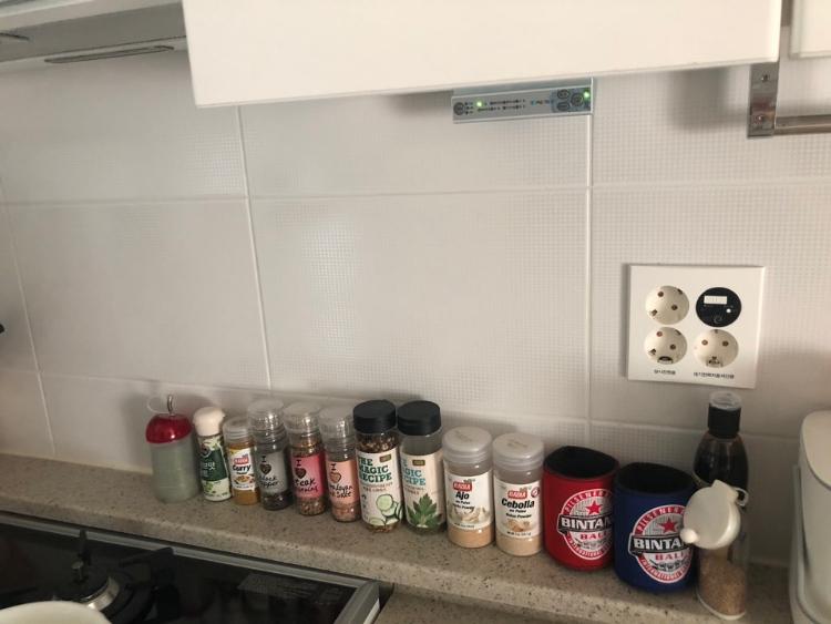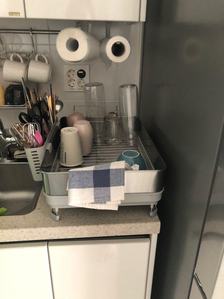 싱크대 위에 식기건조대는 2인용으로 딱 좋아요~ 물도 잘 빠지고요 상 부장에 고리를 걸고 키친타월과 일회용 비닐을 걸어놓았어요~ 보통은 건조대에 식기들 물기가 마르면 수납장안에 그릇들을 넣어놓고 깔끔하게 사용하려고 하고 있어요.