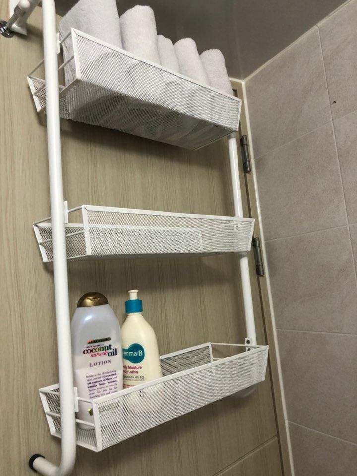 거울 옆에는 수납선반을 붙여서 잡동사니들을 놓았어요. 수거함에도 수건이 있지만 좀 더 공간을 활용하고자 문에 걸 수 있는 수납선반을 두었고 수건과 바디로션을 두었어요.