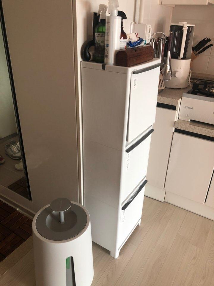 주방벽면에는 압축쓰레기통과 분리수거함이 있어요! 공간활용에 너무 좋아요.