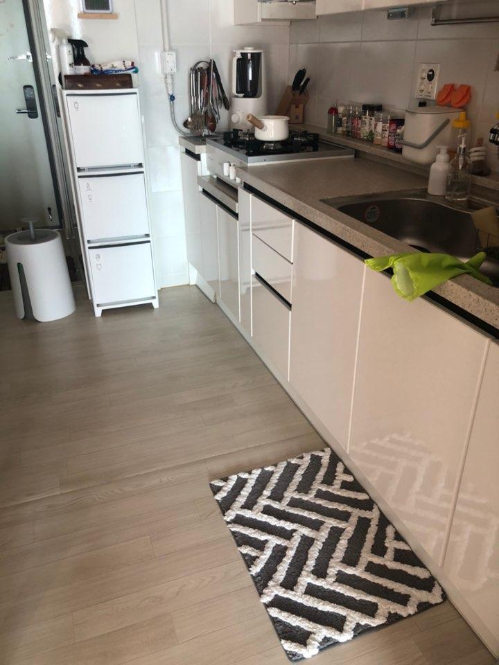 발판이 너무 크면 주방이 좁아 보일 거 같아서 작은 발판을 깔아놓았어요.