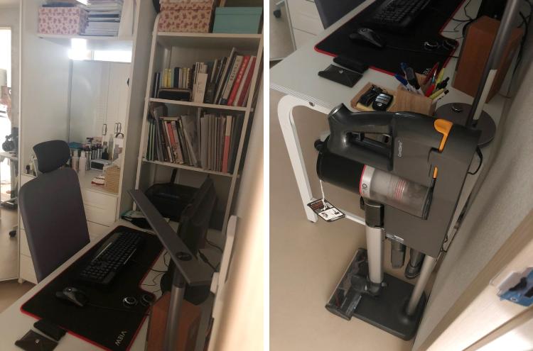 한쪽에는 요렇게 책장과 책상도 사이즈에 맞게 구입해서 넣었어요. 남는 공간에 깨알같이 청소기도 두었어요.