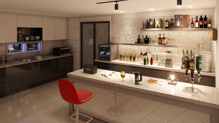 먼저 저희가 가장 고민했던 부분은 홈바를 마련할 공간이었습니다. 세명이 사는 집이라 홈바를 위한 공간을 따로 마련하기는 어려운 상황이었기 때문에, 저희는 주방 한편에 아일랜드 식탁을 설치하여, 요리할 때는 조리 공간으로 활용하고 식사 후에는 홈바로도 활용할 수 있는 공간을 구성했어요.