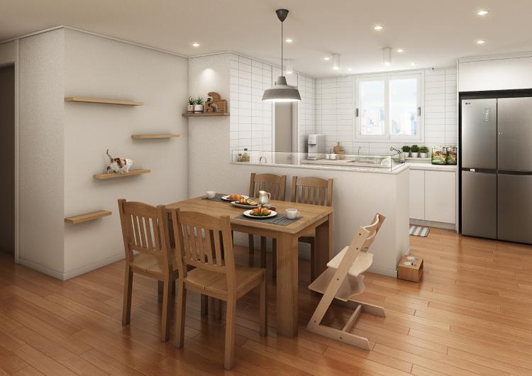 부엌은 상부장을 없애 넓어 보이는 효과를 줬어요. 생각보다 잘 사용을 안하게 되더라구요 ㅎㅎ 그리고 제가 원목을 워낙 좋아해서 식탁과 우리 딸 식탁의자는 모두 원목으로 맞췄습니다. 그리고 인테리어로 설치한 벽 선반에 자꾸 올라가려고 해서 왼쪽 벽은 그냥 아예 냥이들을 위한 캣타워 선반을 설치했어요 ㅎㅎ 올라가는 걸 워낙 좋아하는 냥이들이라 캣타워만으로는 충족이 안되더라구요..