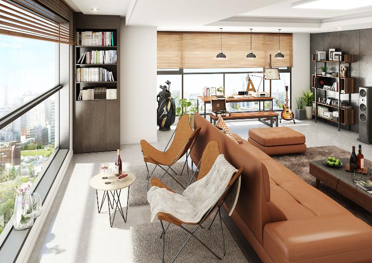 저희 집의 거실은 양쪽에 큰 창이 있어서, 낮에는 불을 켜지 않아도 환하게 지낼 수 있을 정도입니다. 낮에는 햇빛이 들고, 저녁에는 야경을 볼 수 있는 창을 가리기가 아까웠어요. 그래서 정면 쪽에는 작업용 테이블을 두고 낮에 글을 쓰고, 밤에는 야경을 보며 음악을 들을 수 있도록 저희만의 아늑한 공간을 꾸몄어요. 차에는 우드 블라인드를 설치해서 공간에 드는 빛의 느낌도 멋스럽게 느껴지게 연출했어요. 바쁜 하루 끝에 남편과 함께 좋아하는 재즈를 들으며 와인을 즐기는 밤의 시간이 저에게는 정말 소중하고 행복한 순간입니다.