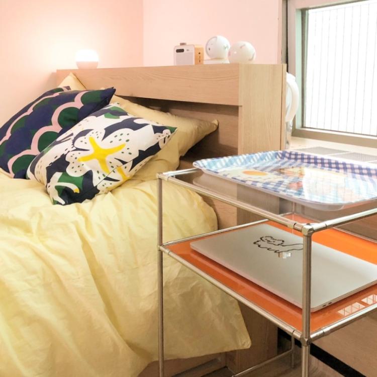 고양이가 있어서 펫 카메라를 설치해두었습니다. 베딩은 밝은 노란색으로, 남색 컬러가 섞인 도형 패턴의 쿠션으로 포인트를 주었습니다.