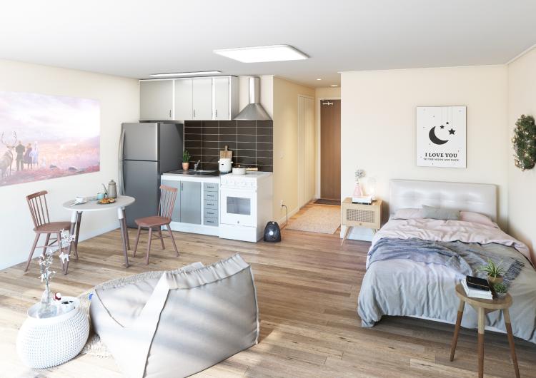 전체적인 자취방의 모습입니다~원래는 1.5룸이었는데, 방과 주방을 나누는 벽을 없애서 넓은 원룸을 만들었다고 하네요. 그래서 실평수가 10평 조금 넘는 넓은 원룸입니다:) 넓은 공간이 마음에 든 것도 있지만 모노톤의 주방이 너무 마음에 들어서 이 집으로 결정 한 것도 있어요!