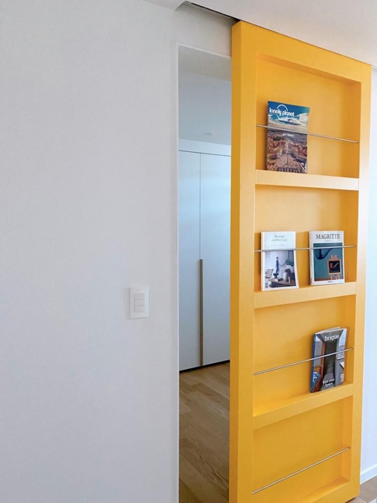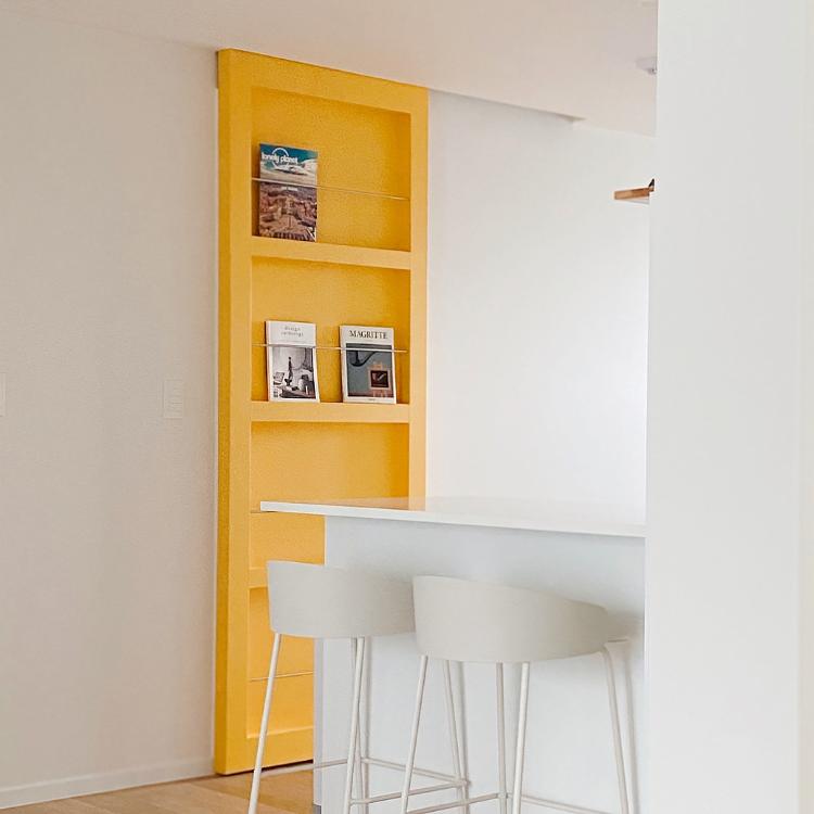 공사를 하면서 하고 싶은 걸 다 하려고 하니 견적이 어마 무시하게 올라가더라고요. 그래서 과감하게 포기할 건 포기하고, 꼭 하고 싶은 것만 하자고 했던 것 중에 하나가 바로 이 슬라이딩 북 도어입니다. 처음에는 무난하게 흰색 계열로 하려다가 주방의 노란 벽 등에 맞게 과감히 노란색으로 질러 보았는데, 결과는 대성공! 옐로홈의 시그니처가 되었네요.