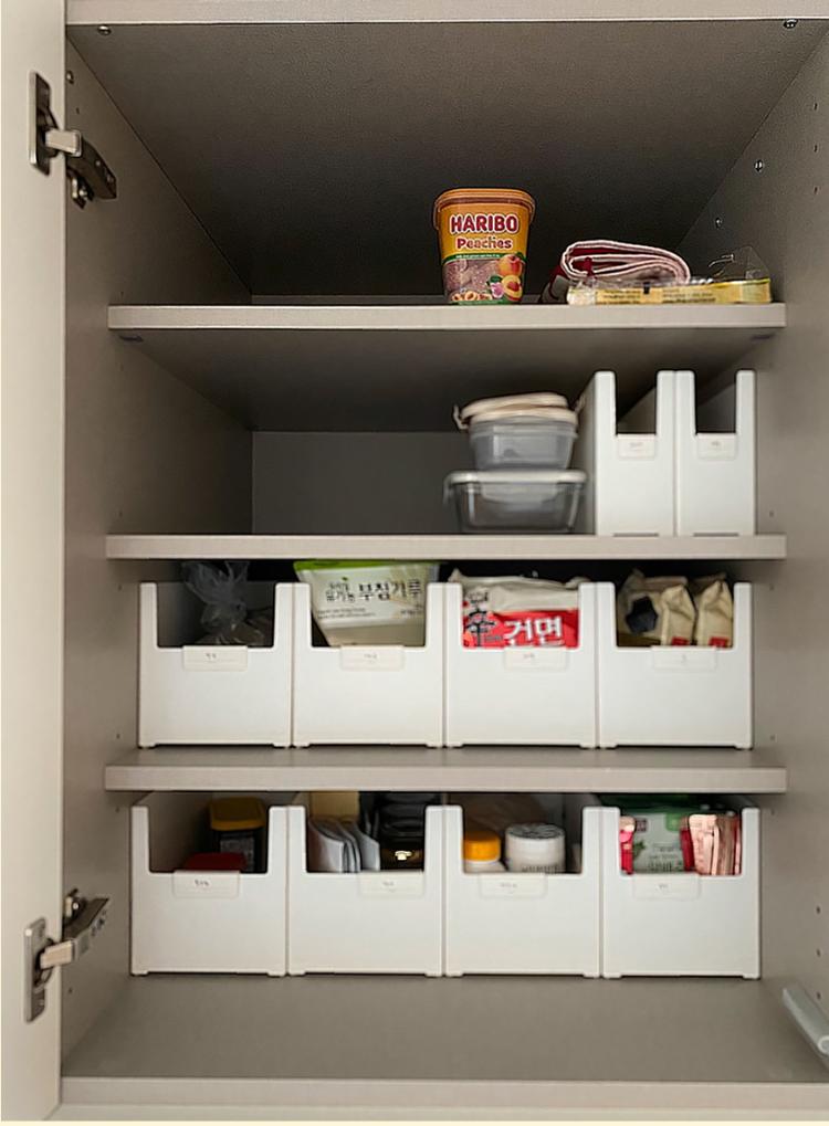 가전장 위쪽 수납장엔 맞춘 듯 사이즈가 꼭 맞는 수납함을 찾아 깔끔하게 잘 정돈하여 영양제나 통조림, 라면 등을 보관하고 있어요.