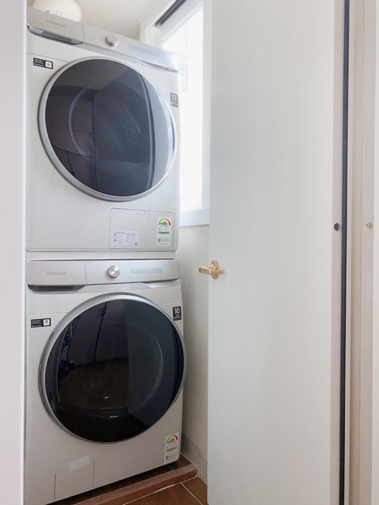 그리고 주방 옆에 있는 베란다는 직렬로 설치한 세탁기와 건조기가 있어요.