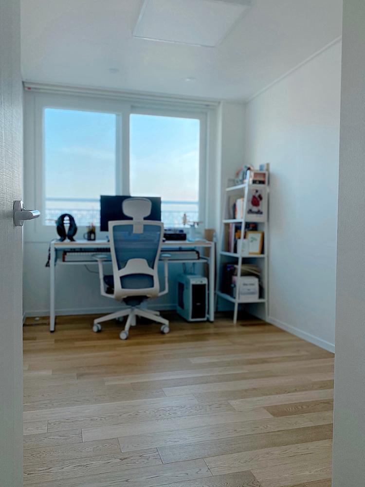 드디어 마지막 공간, 작업실 겸 서재를 소개할게요. 원래 계획상으로는 철제 선반 옆 공간에 피아노를 둘 계획이었는데, 코로나19로 생산 일정에 차질이 생겨 올해 상반기에나 받을 수 있다고 해서 덩그러니 컴퓨터 책상과 선반만 놓여 있어요.