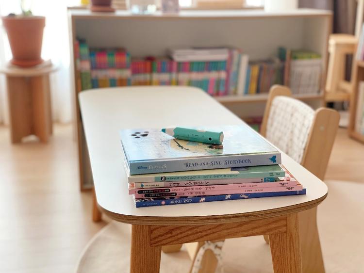 테이블은 거실로 옮겨서 생활 중이에요. 기존에 주방 옆에 배치하여 사용했었는데 아무래도 책을 읽다 보면 넓은 면적의 식탁이 필요할 때가 많더라고요. 넓은 식탁은 활용도가 제일 좋기에 책장 앞으로 옮겨 주었어요. 밥 먹는 식탁 겸 아이가 책도 보고 색칠놀이, 워크북 등 책상으로 겸하여 사용 중이에요.