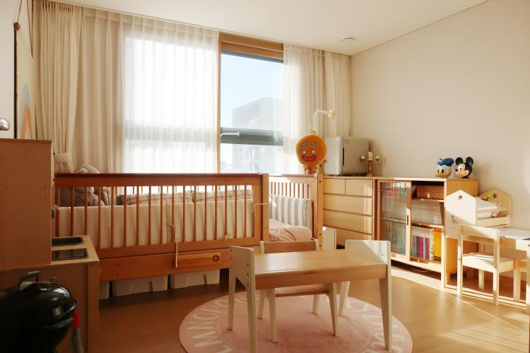 아이 방과 거실은 오크 톤의 밝은 가구들이 들어서는 반면 부부의 침실과 서재 방은 월넛 소재의 가구들을 사용해서 차분한 분위기가 납니다.