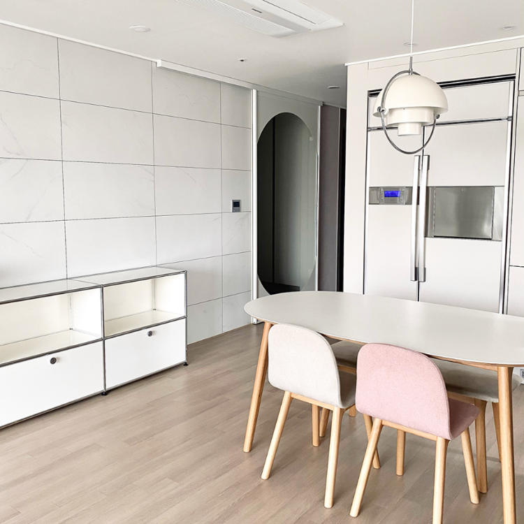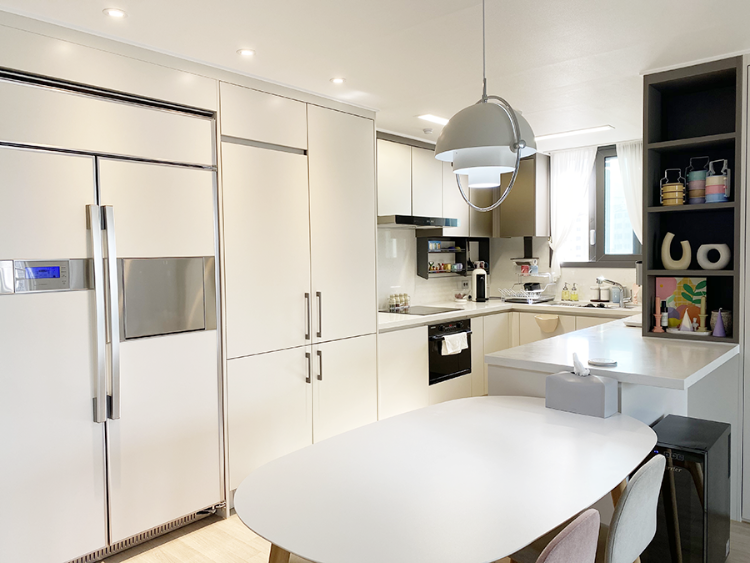 아일랜드와 식탁이 이어지는 듯한 느낌으로 테이블을 배치하였고 모두 화이트 컬러라 질리지 않고 주방이 깨끗해 보인답니다