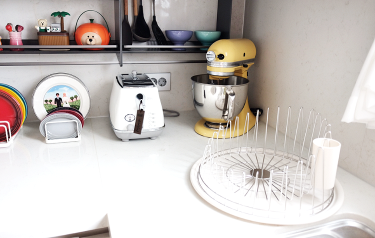 전체적으로 화이트 톤의 주방에 위에 보여지는 용품들은 알록달록한 컬러들이 많아서 지루해보이지 않는 것 같아요 😊