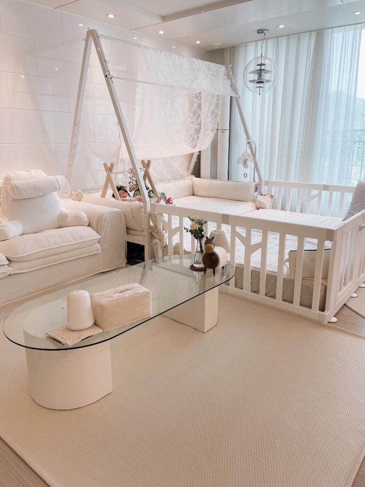 아기가 와서 거실을 많이 변화시켰어요.