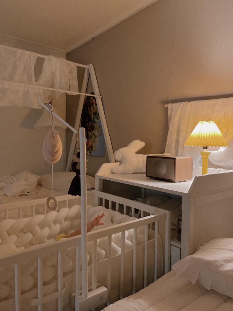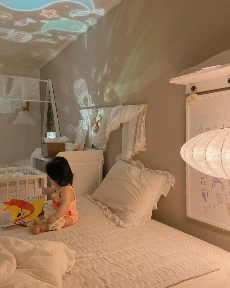 이제는 아가가 어느 정도 커서 아가 침대를 가운데로 두고 무드등도 보며 잠자리 습관을 들이고 있어요.