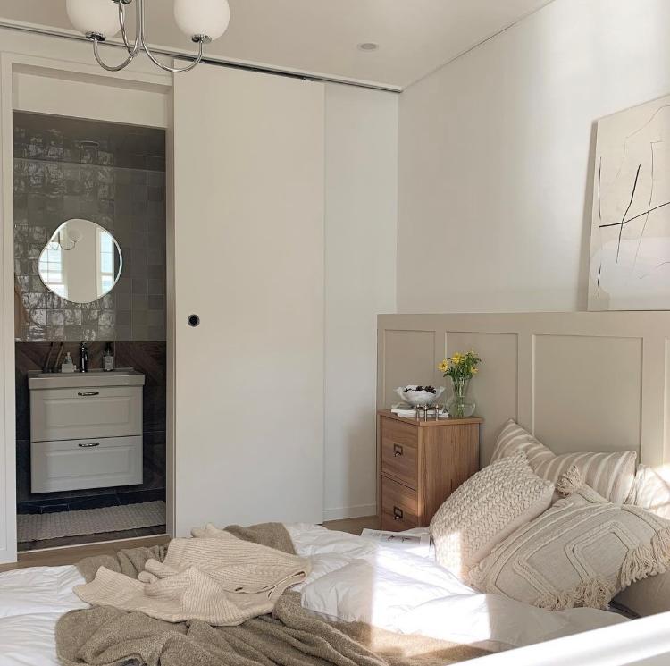 침실 욕실은 슬라이딩 도어로 깔끔하게 연출했고 건식으로 사용중이라 발매트를 깔아주었어요. 건식 사용은 처음인데 물때도 끼지 않고 관리도 어렵지 않아 추천합니다.