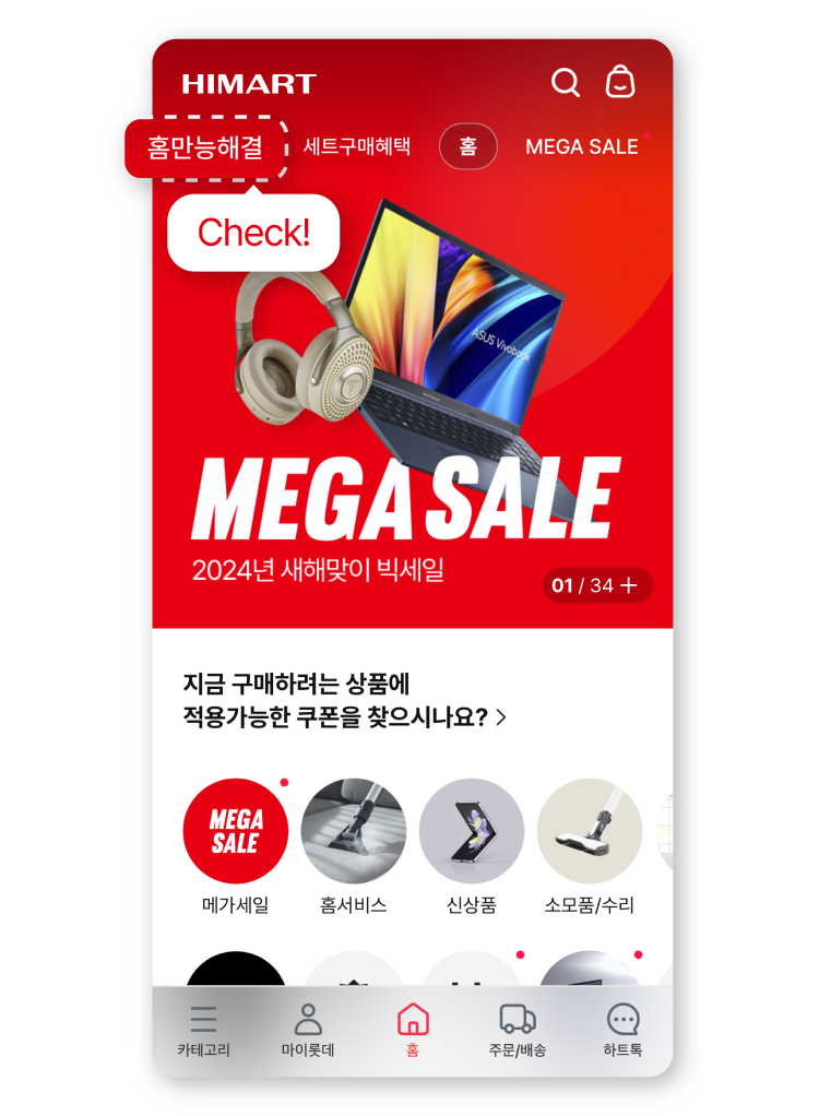 먼저 하이마트 모바일 앱 내 홈만능해결 탭에 접속해 주세요.