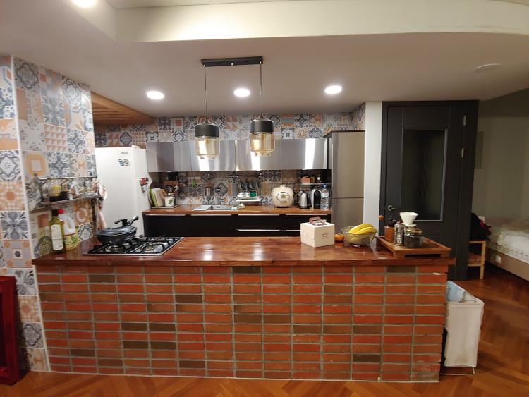 3층짜리 단독주택이고 2층에 주방사진입니다~ 건축가인 언니가 손수만든 집인데 주방이 엔틱한게 가장 맘에 들더라구요ㅎ요리하기 편하게 앞쪽에 가스레인지를 뒀고 보이지는 않지만 냉장고 앞쪽 공간에 큰싱크대가 있어서 나눠서 공간을 사용할 수가 있어요~~