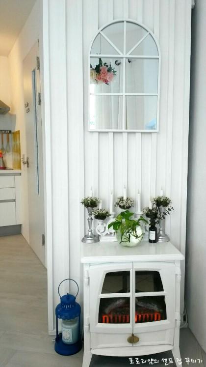 냉장고 옆면이 보이는 게 싫어서 각목으로 직접 가벽을 만들었어요 앞에는 전기 벽난로여요. 같은 게 없어 그냥 아무 벽난로 상품으로 올렸어요