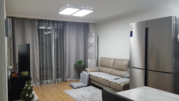 작은아파트라 주방이 따로 없어 거실과 부엌을 냉장고로 나뉘어집니다 좁은공간이길래 그레이색을 바탕으로 꾸며보았어요 어떤가요?