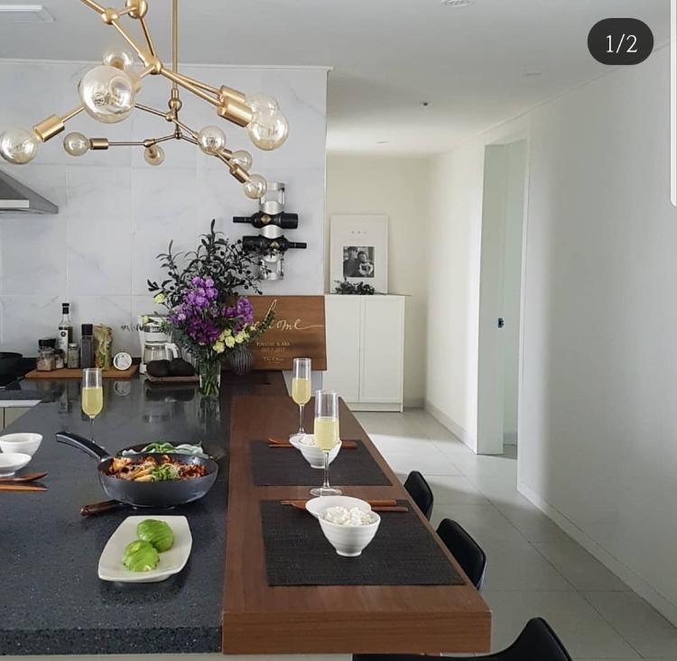 아일랜드형 넓은 조리대에는 원목맞춤으로 부착했어요.