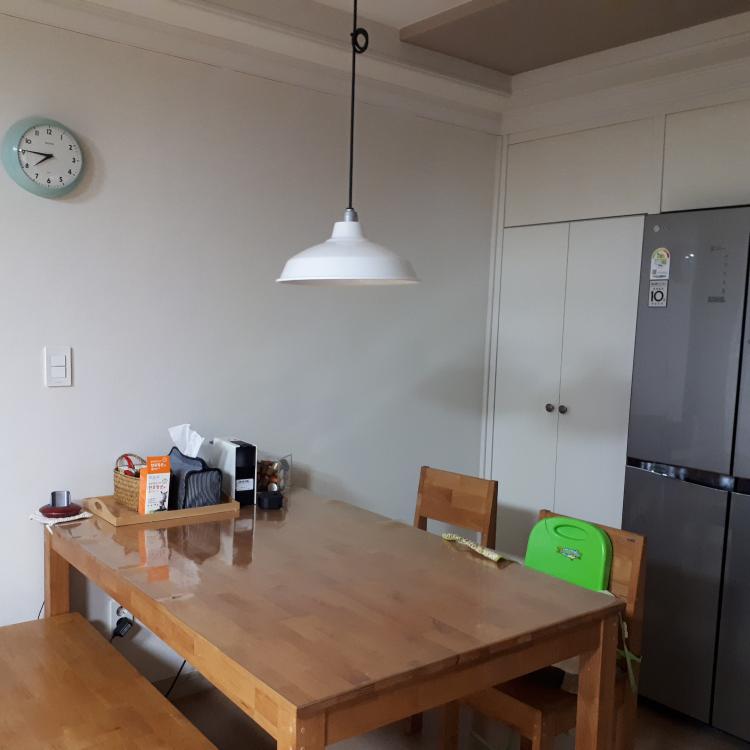 원목식탁과 실버색상의 양문형 냉장고가 있는 주방입니다.