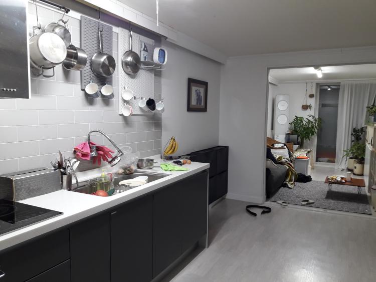 주방과 거실이 일자 형태로 되어있는 구조로 평수가 크지 않아 주방의 씽크대 상부장을 설치하지 않고 거실 TV를 올려놓는 거실장으로 활용하고 있어요.