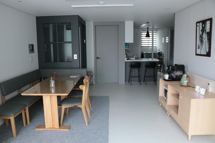 거실에 6인용 테이블을 설치하고 테이블 앞에 홈카페를 꾸몄습니다.