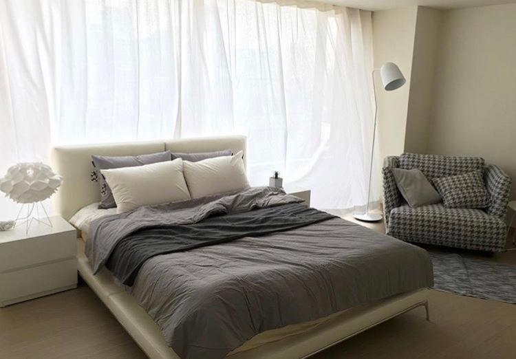 따뜻한 느낌의 침실~^^ 침대 양옆에 화이트 2단