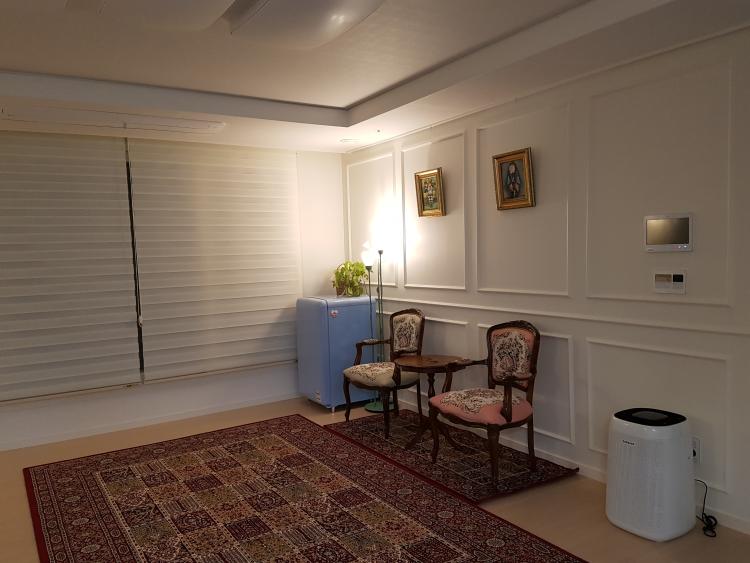 벽면을 웨인스코팅으로 바꾸고 한쪽에 일반 냉장고를 와인냉장고로 사용하고 거실 소파를 없애고 부부 테이블을 설치해서 카페 분위기~