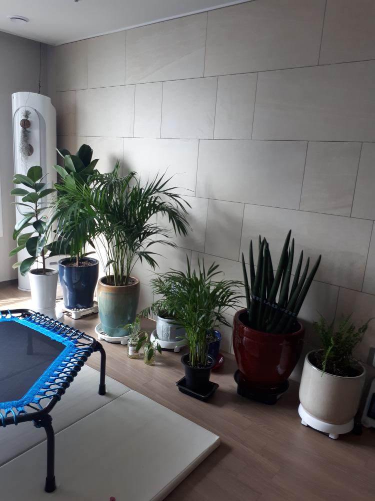 거실에 tv없이 아이 장난감 놀이기구 공기정화식물로만 꾸몄어요 ㅠㅠ 아토피피부염 있는 4살 외동아이고 새집이라 예쁜 인테리어는 포기하고 플랜테리어했네요