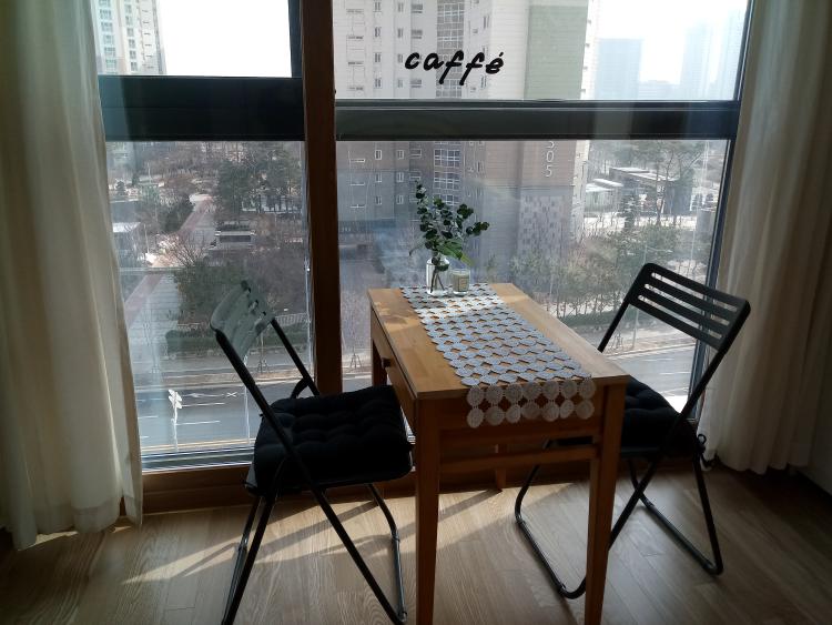 볕이 좋아 테이블과 의자놓고 까페 놀이해요